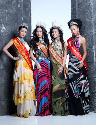 Từ trái sang: Ngân Hà, Quỳnh Thy, Michellel Nguyen và Minh Triệu lộng lẫy xiêm y. Các người đẹp đều đội vương miện những giải thưởng nhan sắc mà mình đạt được.